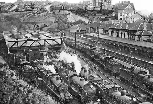 Photo from John Mann collection ![]() With West Marina station on the right, the camera captures a full house at St Leonards Motive Power Depot. Third rail electrification was installed in 1935 from Brighton but it ends at Ore, just east of Hastings, with diesel services beyond to what is now Ashford International. The typical diesel service operates to and from Brighton with the Brighton - Ore section shared with electric trains. The photograph is undated but an approximate year is easy to determine. Most, if not all, the locomotives appear to be in wartime black livery while on the station a large number of canopy support columns and at least two lamp standards are painted black and white as part of the wartime blackout contingency. The shed is in its pre-1949 form, the year it was altered by British Railways. Unlikely, although not impossible, to have been taken during the war and given none of the locomotives appear to be carrying any form of British Railways identity we can safely date the photograph to 1945 - September 1948. The reason for the latter date will shortly become clear. Not all the locomotives can be identified with any certainty but of those which can there are a number of 0-6-0 tender types of Classes C and O1, plus a couple of Class U1 2-6-0s; one on No.3 road and another just inside the shed on No.2 road. Also on No.2 road and nearest the camera is an ex SE&CR Wainwright 'Coppernob' Class D 4-4-0. Of these, only two can be positively identified by number; one of the 'U-Boats' and the 'Coppernob'. The former is No.902; she spent much of her life, unsurprisingly, on the former L&SWR section but did have spells on the Central Section. She became BR No.31902 in September 1948 and survived until November 1962. The 'Coppernob' is No.1740; she was built at Ashford in 1901 and was a St. Leonards locomotive at this time. She was allocated BR No.31740 but withdrawn in March 1951 without receiving her new number.