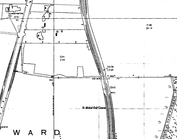 Photo by Paul Wright ![]() Concrete gate posts from a level crossing at St Melyd Golf Links. Passengers would have accessed the halt from the golf course via these gates. The view is looking east, and the stopping place was located on the north side (left of picture) of what had been a level crossing.