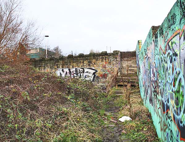 By 1972 no buildings remained on the up platform. The other platform had been narrowed by the encroachment of Shepherd's scrapyard onto the site, and was backed by an unsightly concrete wall. A small hut, the ticket office, stood at the west end of the down platform. Passengers on the platforms therefore had no protection against the weather, but they could shelter in the subway and study the graffiti on the white glazed brick walls.
