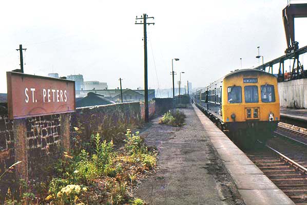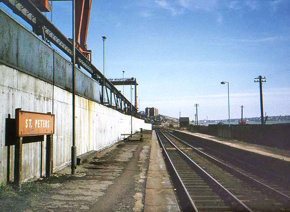 Passenger use steadily declined, measured either by tickets issued or tickets collected. By 1972 with only 1,868 tickets issued, St Peters booked fewer passengers than any other station in the Eastern Region's Newcastle Division, with the exception of Chathill. After closure to passengers, in July 1979 the platforms remained, with the nameboard (plus graffiti) on the down platform. The up line terminated at a buffer-stop at the west end of the platform, but a siding was in place on the south side of this platform. In April 1987 the line was abandoned east of St Peters. The last goods service ran on the Riverside Junction – St Peters section on 25 September 1987 and it was officially ‘taken out of use’ on 31 March 1988.