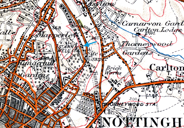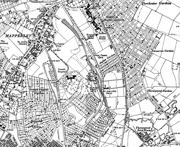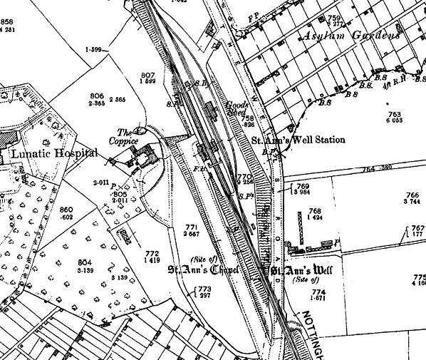 Notes: The station was situated on the western side of The Wells Road and built between two tunnels, Thorneywood (408 yd) to the south and Sherwood (442 yd) to the north. The land for the station approach from The Wells Road was given to the Nottingham Suburban Railway Company by Nottingham City Corporation, who paid half of the maintenance costs. Additionally the historical St. Ann's Well was demolished to accommodate the railway. Opened on 2 December 1889 the station consisted of two facing platforms built linked by a wrought iron lattice girder bridge supported on cast iron columns. As planned the station was to be called The Wells Road, but by the time it opened this has been changed to St. Ann's Well. The station handled a full range of goods traffic including livestock.