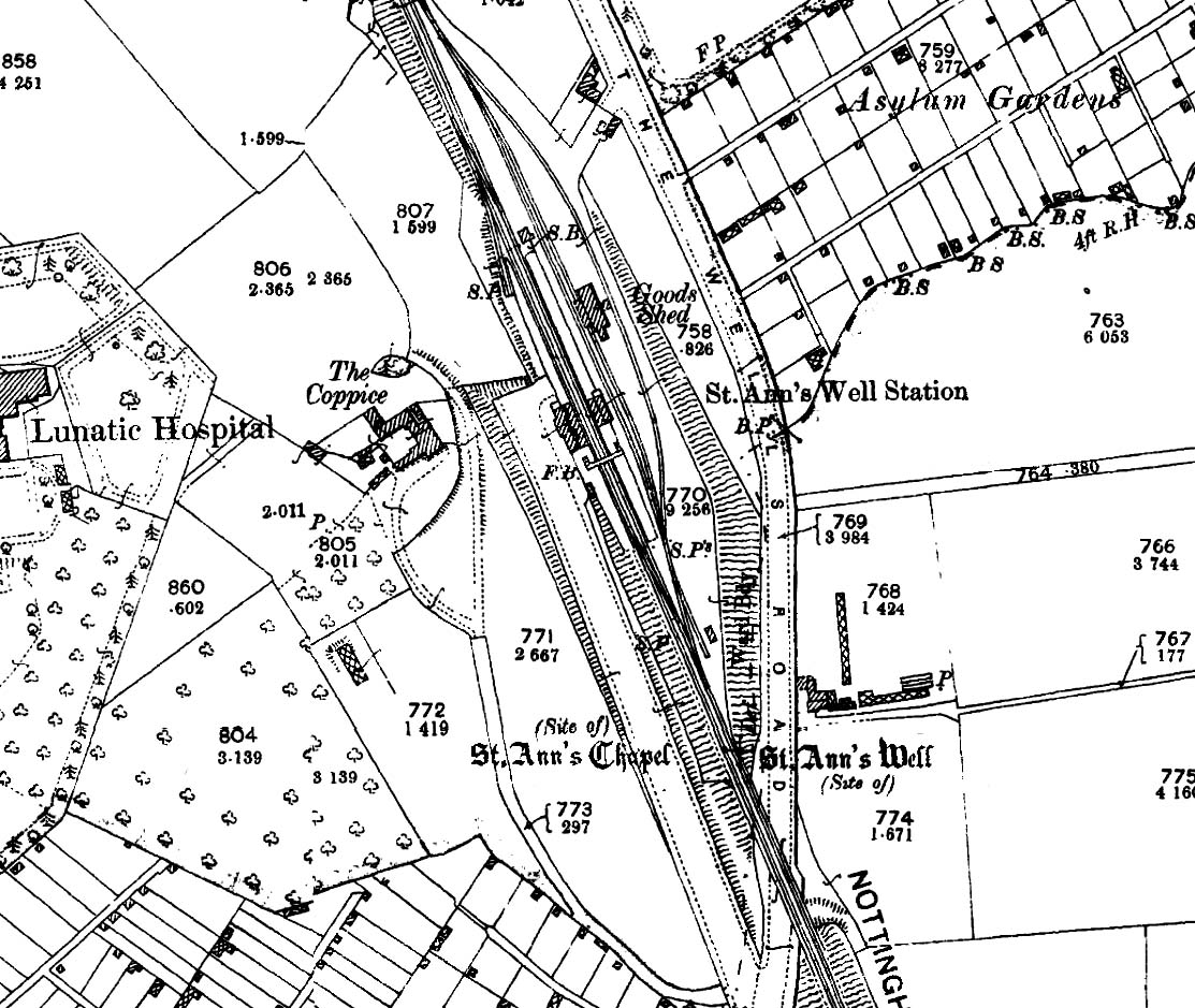 ![]() Station Name: ST. ANN'S WELL![]() 1900 1:2,500 OS map shows the layout of the station and goods yard. There is an approach road running north from The Wells Road to the station forecourt. There are facing buildings on the two platforms with a footbridge spanning the line to the south. The goods yard comprises three parallel loop sidings; two behind the up platform passing the goods shed. There is also a short siding on the down side running behind the north end of the platform. The third loops round the west side of the shed. Access to the goods yard is from The Wells Road. A weighbridge and office is seen just inside the entrance to the yard opposite the stationmaster's house. The signal box is seen at the north end of the up platform. There is a substantial skew arch bridge across The Wells Road to the south of the station.