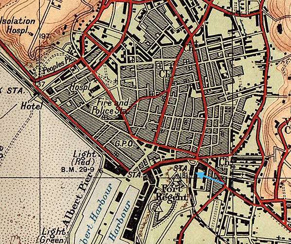 Notes: Snow Hill station was sited at the base of Mont de la Ville upon which Fort Regent was completed in 1814. In order to reach the town centre there was no possible route around Mont de la Ville, so a 600ft long and in places 70ft deep cutting had to be excavated through the outcrop. Due to the time involved to excavate the cutting the station wasn't ready when the line opened in August 1873, so a temporary terminus was opened adjacent to the JER's locomotive depot at Green Street, which allowed time to complete the cutting and build Snow Hill station. The station eventually opened on 6th May 1874.