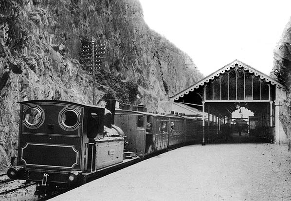 There was a cobbled approach crescent running from Hill Street and Snow Hill. As built, the station was austere, hemmed in by high cliffs on two sides, with a 300ft long platform on the down side sufficient for one long or two short trains. There was a water column at the south end of the platform. The booking office, waiting rooms and station offices were all contained |