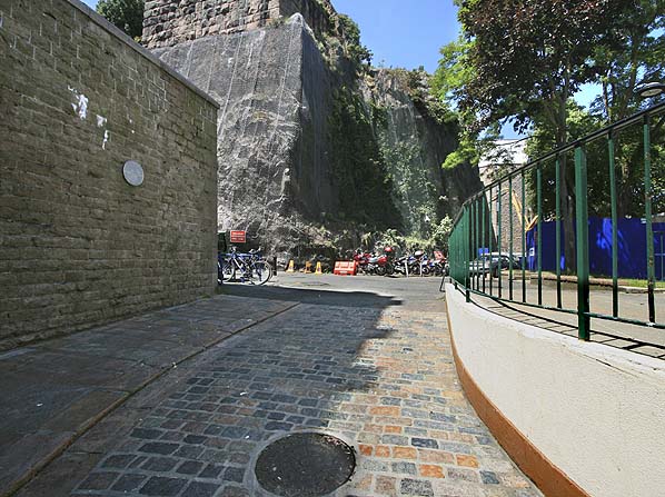 ![]() The approach crescent to Snow Hill station in June 2010. The entrance was at the end of the wall by the bicycles. Note the blue plaque on the wall commemorating the station. Photo by Nick Catford