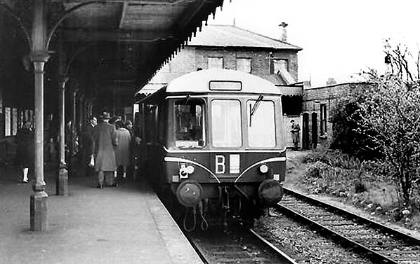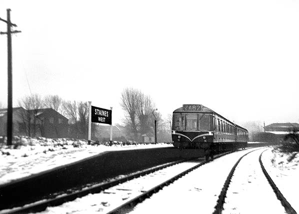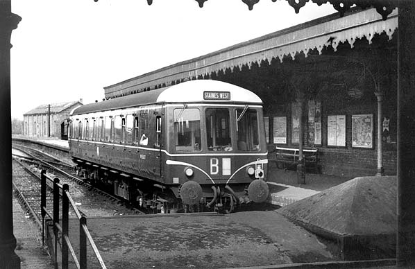 ![]() ![]() A single-car Pressed Steel Class 121 DMU arriving at Staines West with a local service from West Drayton c. early 1960s. Photo by Tom Akers ![]() A class 121 2-car DMU deprting from Staines West station c. early 1960s. Photo by Tom Akers ![]() Passengers waiting for the train at Staines West station c. early 1960s. ![]() A single-car Class 108 DMU seen from the concourse at Staines West station c. early 1960s. The goods shed is seen in the background. ![]() A Class 121 DMU approaches Staines West station c. early 1960s. The water column is seen to the left. Staines signal box is out of view behind the DMU, and the goods shed, which has not been used since 1953, is seen to the right. ![]() Staines West goods shed c.1962 shortly before the good yard was cleared to make way for an oil storage depot. Photo by Keith Jaggers from Jaggers Family History web site ![]() Staines West goods shed c.1962 shortly before the good yard was cleared to make way for an oil storage depot. The station's 6-ton crane is seen in the background. Photo by Keith Jaggers from Jaggers Family History web site ![]() Staines West goods shed c.1962 shortly before the good yard was cleared to make way for an oil storage depot. Photo by Keith Jaggers from Jaggers Family History web site