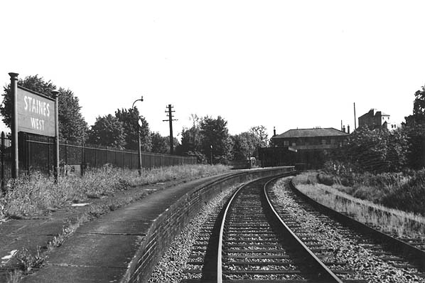 The long platform at Staines West station in the 1950s. By the 1960s the fence at the back of the platform had been removed.