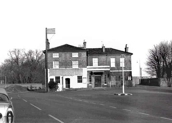 Staines West station forecourt in November 1967. The entrance to the goods yard is to the