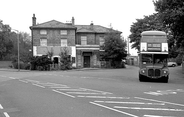 Staines West station forecourt in July 1975. A London Transport Routemaster bus bound for Brentford waits to depart