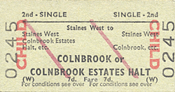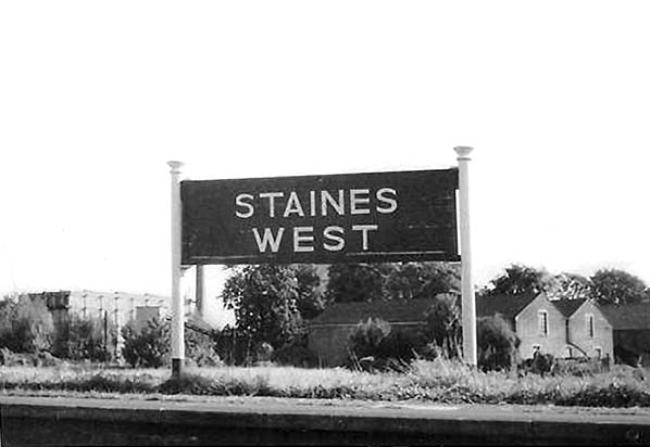 Staines West running-in board in 1958. It appears to be hand-painted in a non-standard font