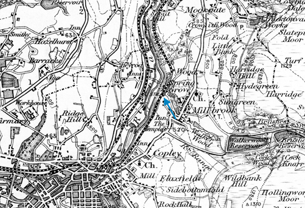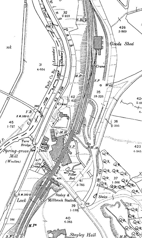 arrived on the scene. Photo from Tameside Archives ![]() ![]() 1898 1: 2,500 OS map. There is a considerable distance between the passenger and goods facilities at Staley & Millbrook – a feature found at all four of the stations on the Micklehurst Loop. The passenger station is at the southern edge of the map. The station house (just south of the 404ft spot-height) and booking hall, adjoining it to the north-west are both shown to have canopies extending onto the road frontage. Covered stairways are shown either side of the lines, leading to the platforms on which buildings and canopies are seen. Immediately north of the station is a row of cottages; although the cottages might look as if they were built for railway staff they pre-date the railway. A clear impression can be gained of the difficulties in constructing this line. The station’s down (west) platform is perched on an embankment, but the steep slope has been hollowed out to make space for the up platform and building, which nevertheless are at a higher level than the station house and booking hall. A viaduct then carries the railway across the Swineshaw Brook valley and slices through Spring Grove woollen mill (shown on an 1878 map, thus pre-dating the railway). Continuing north a substantial embankment has been constructed to provide a sufficiently wide level site for the goods yard, constrained to the west by the Huddersfield Canal and the River Tame which here run side-by-side. The principal structure of the yard is the ‘Goods Shed’ (warehouse), through which two sidings pass. The weigh house is shown as an extension of the shed to the south. A yard crane is also named.