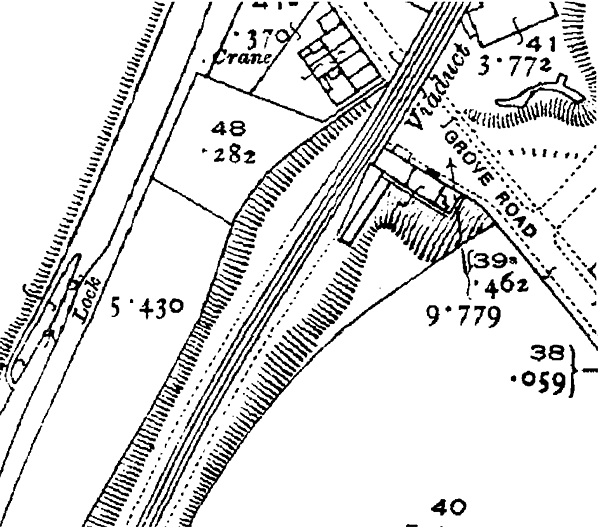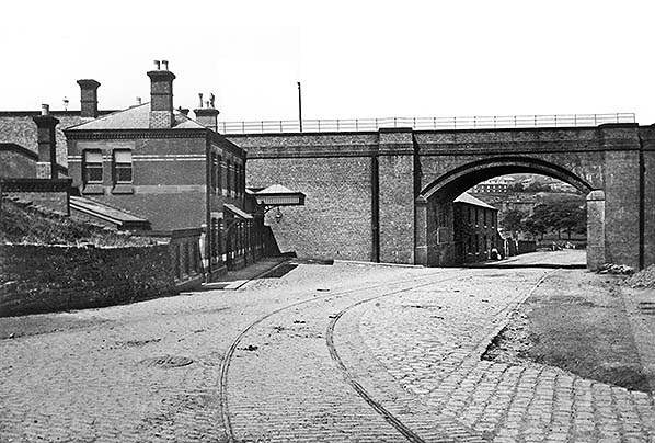 Photo by David Rostance from his Flickr photostream ![]() Looking west along Grove Road in May 2012 towards the site of the former Spring Grove Viaduct. The main building of Staley & Millbrook station used to stand to the left of the road, set back a little, close to the position of the lamp standard. Similar viewpoint to the 1910 picture above.