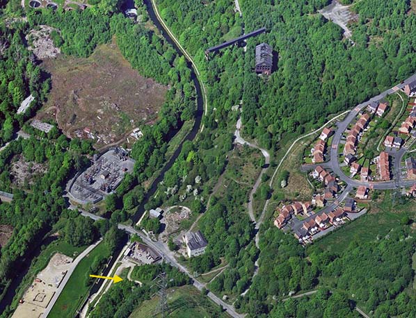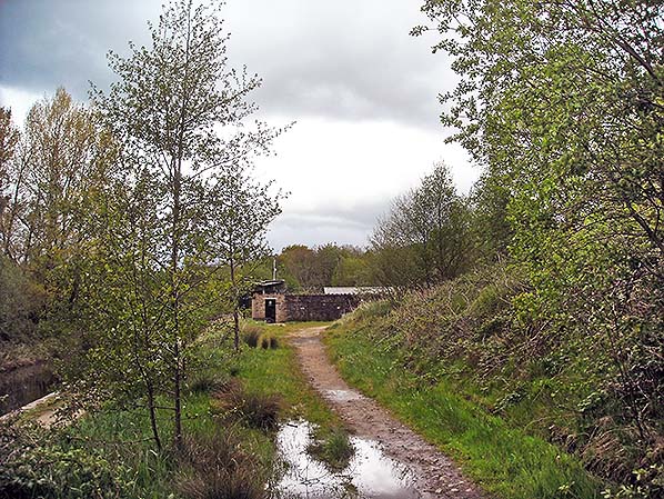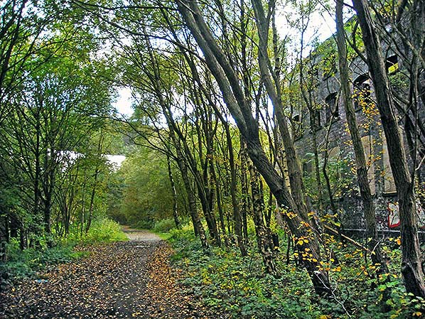Photo by Alan Young ![]() This view is looking north along the footpath that follows the course of the Micklehurst Loop railway. In October 2015 the disused goods warehouse of Staley & Millbrook station, seen to the right, is extant but decaying. The structure in the sky about 100yd ahead is the remains of the conveyor by which coal was moved from Millbrook Sidings to Hartshead Power Station. It has been out of use since the 1970s.