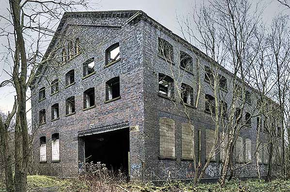 Photo by Tom Hindley, reproduced from Geograph under creative commons licence ![]() The derelict railway goods warehouse at Staley & Millbrook, looking south-east in December 2014