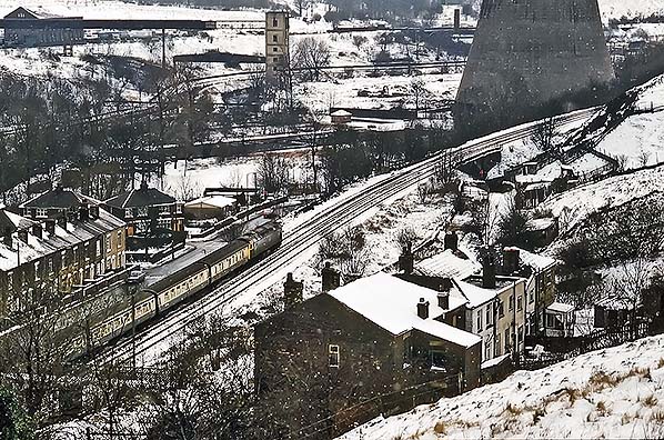 Photo by Vanessa Dixon from her Flickr photostream ![]() In February 1986 a southbound express on the Huddersfield-Manchester line approaches one of the cooling towers of the disused Hartshead Power Station. In this south-eastward view the warehouse of Staley & Millbrook goods station on the former Micklehurst Loop railway is in the top left corner, partly obscured by the elevated conveyor by which coal from Millbrook Sidings (beside the goods station) was moved to the power station.