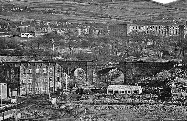![]() This view, looking south-east from Hartshead Power Station towards Staley & Millbrook station in January 1980 highlights the southern end of the Spring Grove Viaduct with its wide arch over Grove Road. Staley & Millbrook passenger station building used to stand immediately beyond this arch, and the station’s platforms were immediately to the right of the edge of the photograph. Obscuring the viaduct on the left is Spring Grove Mill, notable for its serrated roofline with ‘North Light’ windows. Staley Mill (cotton) is in the background.