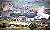 ![]() An oblique aerial view looking north towards Hartshead Power Station circa 1951. Staley & Millbrook passenger station (closed in 1909) is at the lower right corner, and the roof of the station building is just visible. The Micklehurst Loop railway on the Spring Grove Viaduct cuts through Spring Grove Mill and curves to the left past Staley & Millbrook station’s goods warehouse and yard. The extensive Millbrook Sidings are seen to the right of the warehouse; these were built to accommodate wagons bringing coal for the power station, which opened in 1926. The coal from the building at the sidings is carried on a conveyor which can be seen striding across the Micklehurst Loop, then over the canal and the River Tame to the power station, readily identified by its two tall, smoking chimneys and pair of cooling towers. To the left of the power station the original Huddersfield-Leeds railway via Mossley and the A635 road can be seen curving off the left (western) edge of the image.