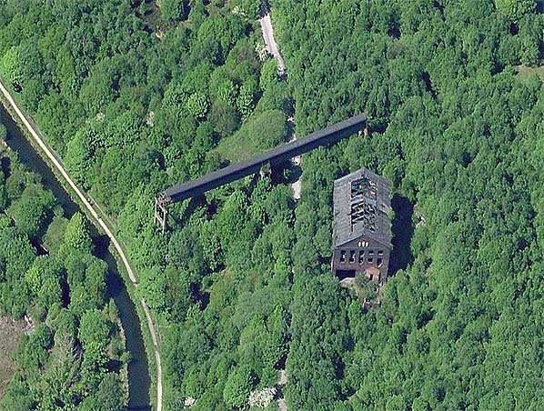 A recent aerial view of Staley & Millbrook station: north is towards the top of the image. The course of the Micklehurst Loop railway can be seen running from south to north through the woodland, and it is now a footpath. The derelict goods warehouse is seen to the east of the footpath, with many of the roofing slates missing and rafters exposed to the elements. A section of a disused overhead conveyor crosses the course of the railway just north of the warehouse; this was the means by which coal was taken from Millbrook Sidings – whose site was beyond the eastern edge of the photo - and across the canal (on the western edge) and River Tame to Hartshead Power Station which closed in 1979 and has been demolished.