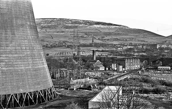 ![]() Station Name: STALEY & MILLBROOK![]() Looking south-east from Hartshead Power Station towards Staley & Millbrook station in January 1980. Beyond the power station’s cooling tower in the foreground, Spring Bank Lane / Grove Road can be seen passing the tall structure of Spring Grove Mill, notable for its serrated roofline with ‘North Light’ windows, then passing under the wide arch of the viaduct. Staley & Millbrook passenger station building used to stand immediately beyond this arch, and the station’s platforms were immediately to the right of the edge of the photograph. Staley & Millbrook goods station was about 200yd beyond the west end of the viaduct. The passenger station closed in 1909 but the goods station survived until 1964. Hartshead Power Station ceased to be rail-served in 1972, but the railway to it through Staley & Millbrook was not taken out of use until 1976. The power station closed in 1979, shortly before this photograph was taken, and has since been demolished. The spire of St James’s Church is prominent in the distance in the centre of the photograph, as is Staley Mill, far right.