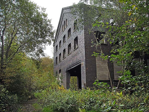 ![]() Station Name: STALEY & MILLBROOK![]() The derelict railway goods warehouse at Staley & Millbrook, looking south-east in October 2015 from the trackbed of the Micklehurst Loop. This location is about a quarter of a mile north of the former passenger station. The area formerly occupied by the goods sidings and Millbrook coal sidings is now dense woodland. The warehouse is similar in style to the others on the Micklehurst Loop, being constructed of blue engineering brick. It was a ‘two-road’ shed, meaning that two sidings entered it. The roof is in a dilapidated condition.