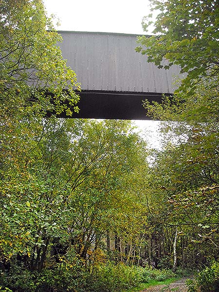 ![]() Station Name: STALEY & MILLBROOK![]() Some modern and unlovely industrial archaeology is visible just north of the old goods warehouse at Staley & Millbrook. This is what remains in October 2015 of the overhead conveyor by which coal was moved from Millbrook railway sidings to Hartshead Power Station. It has been out of use since the 1970s. The path follows the trackbed of the Micklehurst Loop railway. Photo by Alan Young