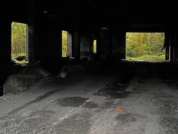 The interior of Staley & Millbrook station’s goods warehouse looking north in October 2015. Two railway sidings passed through the opening ahead and the similar opening behind the photographer.