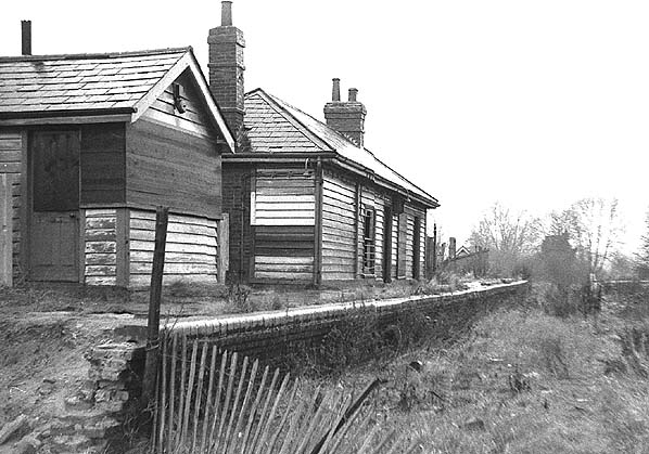 ![]() Looking south in June 1975 the view is less rural. Stortford Road is seen beyond the platform and the mill building is seen on the left. Milling on the site ceased in the 1950s.