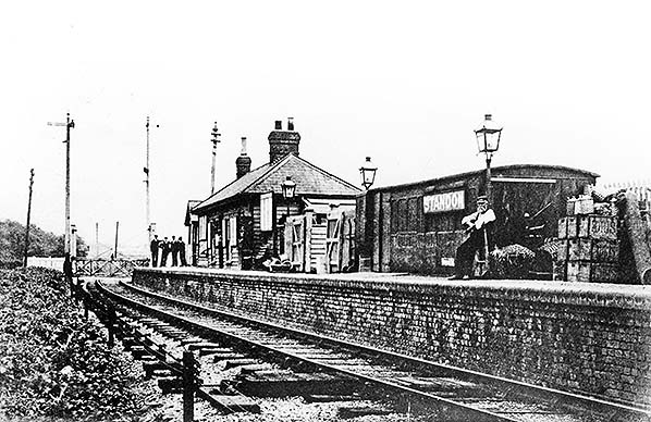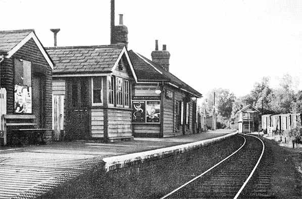 ![]() Standon station station looking south towards the Stortford Road level crossing.One of the station sidings runs behind the platform up to the station building.