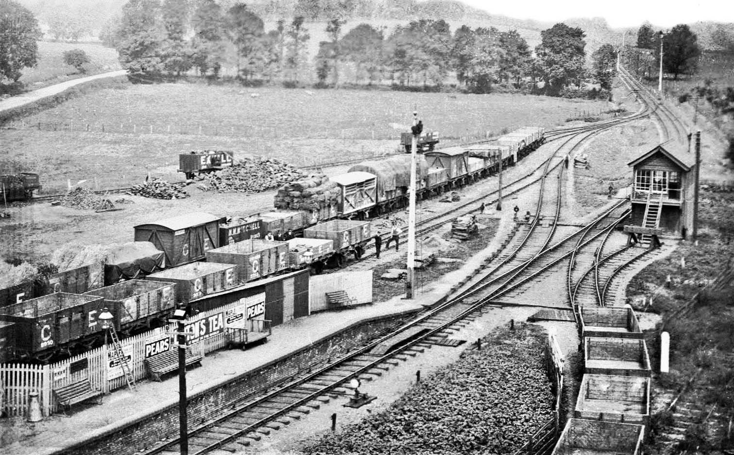 ![]() Station Name: STANDONA view looking north across Standon goods yard with part of the station platform visible at lower left. The date of this postcard photograph is unknown but there are clues. It is photographed from the adjacent flour mill which dated from 1901, therefore this is the earliest possible date. The mill, more correctly 'flour mills' as the 1901 mill was linked to the earlier corn mill on the opposite side of the River Rib which is out of view to the right, was served by the siding seen at bottom right. It was a private siding, hence the presence of the gate marking the boundary with railway land, and the running line was protected by the short trap siding ending at buffers beside the signal box which had a Saxby & Farmer 20-lever frame with duplex locking. Note the various shunt signals and points indicators located around the site. The tall signals were necessary due to the curvature of the line through and either side of Standon station. On the platform an array of typical period advertisements can be seen, along with a conical mike churn while a ladder is propped against an oil lamp. These lamps required a lot of attention; filling with paraffin; wicks trimmed; casement glass cleaned; lighting and extinguishing as necessary. This work was usually the job of a porter. The wooden hut just before the platform ramp is curious as it appears to be erected at ground level behind the platform and if so would have internal steps leading to the door onto the platform. The purpose of the hut is unknown, as is whether or not it also had access from ground level. Such huts on or adjacent to station platforms were usually lamp rooms, but in this instance the peculiar design means this use should be treated with caution. The goods yard was conveniently laid out with access from both Up and Down directions, but in practice the collecting and dropping-off of wagons would have been done when the goods train was operating in the Down direction, ie towards Buntingford. Two goods loading gauges are present, one to the left of the trap points, right of centre, with the other just visible in the distance just before the junction between sidings and running line. The existence of the loading gauge to the left of the trap points is rather strange as that further along near the junction would render it superfluous. The goods yard was not provided with a crane, thus limiting the categories of goods which the yard could handle; the yard did not handle livestock. The wagons present are mostly those of the Great Eastern Railway but there is at least one Southern Railway example and four private owner wagons. The name on the wagon on the coal siding and adjacent to the coal heap is obscured by appears to be 'Exhall' but this leaves us with a puzzle. If the name refers to Exhall Colliery, this was located near Bedworth, Coventry, but the location of the wagon's home base can be seen under magnification to be Darlington. Another wagon, this time nearer the camera, carries the name M.M.Mitchell and the home base of Ipswich. The firm had been Booth & Mitchell but the partnership was dissolved in 1907. M.M.Mitchell was, in full, the rather unusual name Margetts Mitchell Mitchell. Margetts died on 29 January 1928 and the record of her death states occupation as 'coal factor' so from this we know Margetts continued running the business subsequent to the dissolving of the partnership with Booth. Whilst we can establish the date of the photograph to be no earlier than 1901, the M.M.Mitchell wagon would therefore suggest no earlier than 1907. Another wagon of interest is that coupled to the cattle wagon. It is an open wagon loaded with what appears to be bales or sacks and, as it happens, illustrates well the purpose of goods loading gauges. Quite what commodity is loaded onto the wagon will never be known but it seems to be something which would not matter if it were exposed to wet weather, such as old rags used in the production of paper. Standon once had a paper mill, located south of the village on Paper Mill Lane and close to the spot where the railway crossed the River Rib on a skew bridge. However, as far as can be determined the paper mill ceased operations sometime in the latter half of the 19th century so, if correct, the wagon is unlikely to be loaded with rags unless destined for another paper mill elsewhere. Two further open wagons, extreme left, are loaded with what appears to be bundles of reeds, perhaps for thatching. Lightweight wagon loads such as this and the bales or sacks were most uneconomical for the railways and the items seen in this view, coal excepted, are an omen to the demise of goods by rail which was to begin after WWI when cheap and reasonably reliable road motor transport became easily available. The road in the left background is Station Road. It runs from Kents Lane, now the A120, which the railway crossed via a level crossing at the immediate south end of the station, to Puckeridge where it meets the A10 Cambridge Road. The scene today is unrecognisable as the area between Standon and Puckeridge is now largely built-up, effectively linking the two villages as one. At the junction of Kents Lane and Station Road the public house known variously as the Railway Tavern or Railway Hotel once stood. As of 2018 the building still stands and is in use as a Chinese restaurant. Of Flour Mills, as it is called and once known as New Mill, production is thought to have ceased sometime in the 1950s although in 1956 British Railways still listed what was by then British Soya Products Ltd. siding as a facility at Standon. The Flour Mills building was renovated in 2005/6 and is today in residential use. It retains its tablet stating "Standon Flour MIlls" along with the year 1901. Of the former railway, apart from disused trackbed north and south of Standon no obvious trace now remains within the village.standon