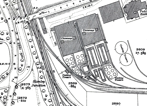 On 12 June 1901 an order was placed for a lever frame for a new signal box for Stanley Junction. At this time the Liverpool Corporation had started to build a power station at Lister Drive (to the north of the cattle market branch) and it was to be rail served. The power station branch diverged from the main line 5 chains to the north of the cattle market branch just to the south of the Lister Drive overbridge.