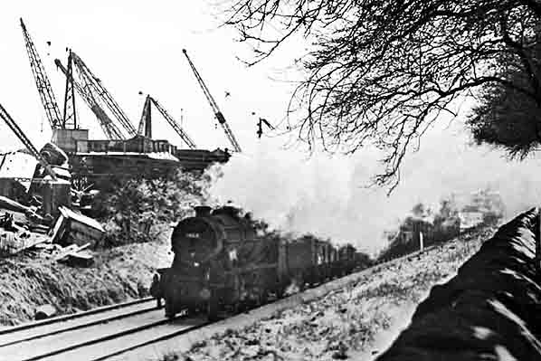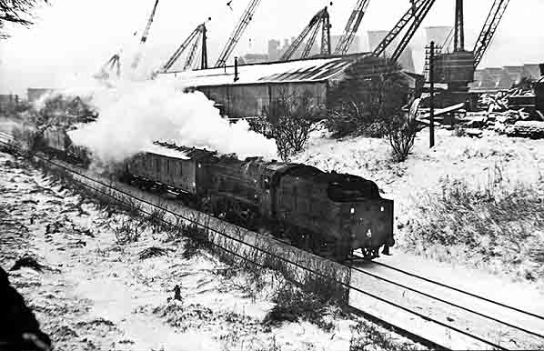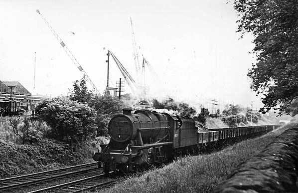Photo by Norman Daley ![]() be seen in the distance. Photo by John Gahan ![]() A mixed goods train is seen passing through the site of Stanley station in January 1967. Photo by John Gahan ![]() Looking south towards Stanley station from Stanley Junction on 24 August 1967. Heading north to the docks is an ex-LMS 2-8-0 8F locomotive on a long freight train. To the left the branch to Stanley Cattle can be seen. Photo by John Gahan ![]()