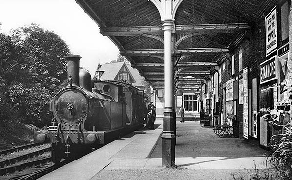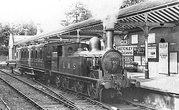 ![]() Station Name: STANMORE VILLAGEStanmore Village Station Gallery 2: 1920s - 1950s ![]() Ex-LNWR Webb 0-6-2T No.7700 waits with its no-doubt-adequate single carriage at Stanmore sometime in early LMS days. The locomotive was of the class better known as 'Coal Tanks'. She had been LNWR No.161. Of the originally 300 strong class, those which survived to receive BR numbers were lumped together into the 58880 - 58937 series. Of those one, BR No.58926, originally LNWR No.1054 and then LMS No.7799, has survived into preservation. The carriage is an ex-LNWR 7-compartment brake and appears to be an all-third but has otherwise proved difficult to identify. Perhaps an LNWR expert can throw some light onto it. Typical of the period, a number of advertisements can be seen of which many names are still familiar today. Sometimes advertisements can help to date a photograph and the London Coliseum's showing of The Chinese Puzzle might have been one such but no record can be found of it. On the matter of puzzles, another concerns the name on the platform seat (partly obscured by the locomotive smokebox). It is unreadable but it does not appear to announce Stanmore, this being long before the station became Stanmore Village.