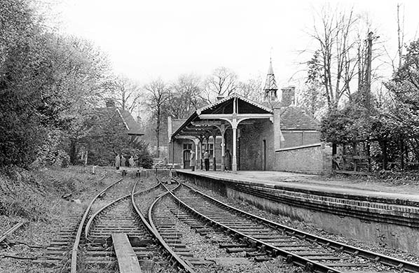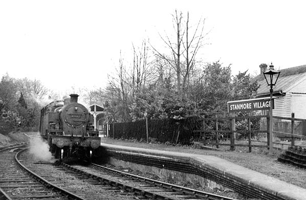 Copyright photo from John Alsop collection ![]() Fowler Class 3P (3MT under BR) 2-6-2T No. 40043 waits at Stanmore Village with an immaculate Pull & Push set on Saturday 13 September 1952, the final day of the passenger service on the section beyond Belmont. No. 40043 was a Watford locomotive at the time, this depot being responsible for operating the branch, and she carries Watford's '1C' shedplate. The 70-strong Fowler 2-6-2T class was quite scattered over the former LMS system but was reasonably prolific in the London area including on suburban trains out of Euston and St Pancras. They were however poor performers and better suited to untaxing work such as on the Stanmore Village and St Albans Abbey branches. William Stanier built his own version, with taper boiler, and these were no better. Both types became extinct in 1962 and many footplate crews were not sorry to see the back of them. No. 40043 with withdrawn in November 1959 from Willesden shed, having been well recorded by photographers. More successful were the LMS Pull & Push sets with their vacuum-operated control equipment. Most if not all were conversions from standard 57ft hauled stock and the conversion process was briefly continued by British Railways. Photo by Neil Davenport ![]() ![]() Stanmore Village station looking north towards the buffers sometime in the 1950s. The station closed in 1952 but apart from the removal of signs little changed until the station was largely demolished in 1970. The canopy is seen here in its shortened form. Its length was reduced by 40ft by British Railways. The cabmen's shelter seen in the 1900 picture at the end of the platform has gone. It was dismantled and re-erected close to the entrance to the goods yard for use as an office for Franklins coal merchant.