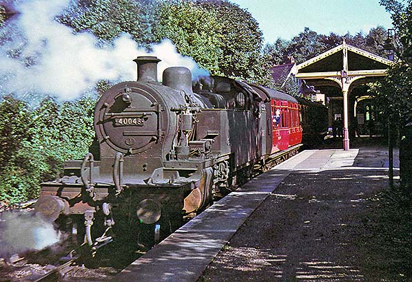 Photo by Dewi Williams from Dewi's Trains, Trams & Trolleys web site ![]() Sometime in 1952, shortly before closure that year to passengers, Fowler 2-6-2T No.40043 trundles away with the push-and-pull train to Harrow & Wealdstone. The branch was worked from Watford shed where No.40043 was resident at this time. She was to end her days at Willesden shed in 1959. Note the BR totem and, right, the goods shed. Only one Stanmore Village totem has ever been sold in an auction. Goods traffic was to keep the section beyond Belmont open for a further twelve years.