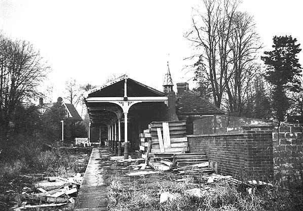 ![]() Station Name: STANMORE VILLAGE![]() Stanmore Village station looking north in December 1967. Following closure to goods traffic on 6 July 1964 the track was quickly lifted that September. The last train departed from Stanmore Village on 21 August 1964. It comprised eight or nine open wagons loaded with asbestos cable ducts that has been stored on the platform in conjunction with electrification of the main line. As can be seen in this view many of the cable ducts were left behind and abandoned. Photo by Nick Catford ![]()