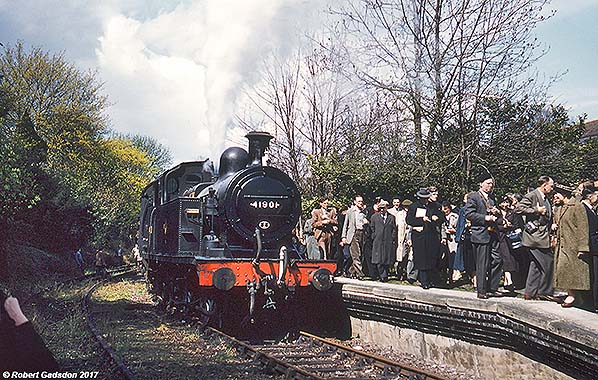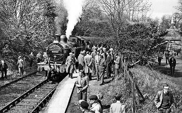 Photo by Dr Neil Clifton ![]() A brief period of activity at Stanmore Village on 27 April 1958. The occasion was the RCTS Hertfordshire Railtour No.2 which commenced at Fenchurch Street and covered, in addition to Stanmore, The Watford - St Albans branch, St Albans - Hatfield and then to Broad Street via Cole Green, Hertford Cowbridge, Cheshunt, Stratford and Victoria Park. The locomotive seen here, a fitted push-and-pull Stanier 0-4-4T, had been in charge for the Harrow & Wealdstone - Stanmore - Watford - St Albans leg of the tour. The train was eight coaches, mainly Gresley corridor stock, but for the Stanmore branch the tour participants transferred into a four-coach push-and-pull train (2 x 2-car sets). The rest of the tour was handled by two Class N7 0-6-2Ts. It should have been one, the then Liverpool Street west side pilot No.69614, but this developed a problem somewhere near Temple Mills. Thereafter what occurred is a little confused; No.69614 made it to Harrow & Wealdstone where she was to wait with train while participants visited Stanmore on the push-and-pull train. No.69614 was either then taken off the train and limped light engine to Watford, where she was failed, or she was towed to Watford by a 4F 0-6-0. Whatever happened, it is the reason why No.41901 took the train on to Watford Junction and St Albans Abbey where the second N7, No.69632, took over for the remainder of the tour. Looking very smart and probably spruced-up for the tour (she had recently been transferred to Watford from Crewe North when this photograph was taken so could have been ex-works) No.41901 was one of a class of just ten locomotives. Although built under William Stanier they were the last locomotives to be built at Derby to what was largely a Midland Railway design, hence their 'non-Stanier' appearance. No.41901 was one of two, the other being No.41909, used on Watford - St Albans push-and-pull trains. In addition, No.41908 had also been at Watford a few years earlier. When this photograph was taken No.41901 still carried a Crewe North (5A) shedplate. All bar one of the class was withdrawn in November 1959, the exception being No.41900 which defiantly soldiered on until March 1962, by then allocated to Gloucester (Barnwood).