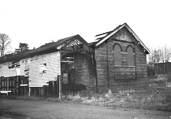 Photo by Ted Burgess ![]() In its last years, the Stanmore Village goods yard handled only coal traffic and the goods shed was rented to a banana merchant. When he moved out after closure of the goods yard the vandals moved in and the goods shed was badly damaged by fire as seen in this view from December 1967.