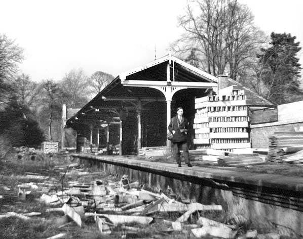 Photo from John Mann collection ![]() Stanmore Village station looking north in 1965. Following closure to goods traffic on 6 July 1964 the track was quickly lifted that September. The last train departed from Stanmore Village on 21 August 1964. It comprised eight or nine open wagons loaded with asbestos cable ducts that had been stored on the platform in conjunction with electrification of the main line. As can be seen in this view many of the cable ducts were left behind and abandoned.