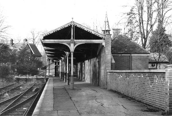 ![]() Stanmore Village station station c1965. The glazed panels in the canopy have been replaced with opaque asbestos panels. The large number of asbestos trunk sections left lying about would have made this a very hazardous place - little did we know.