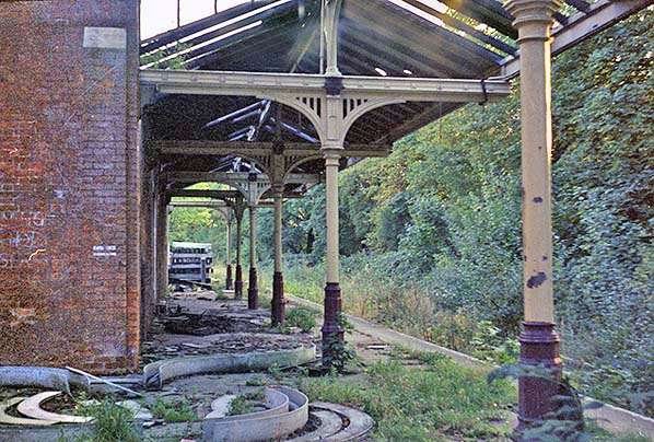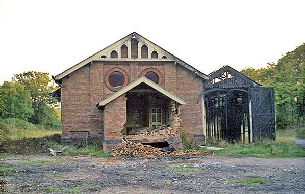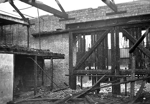 on 21 August 1964. Photo by Nick Catford ![]() Internal view of the goods shed that was gutted by fire after closure of the goods yard in 1964. Little was left other than the brick shell of the building.