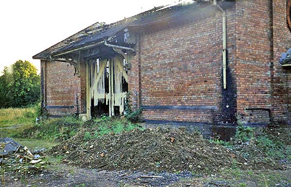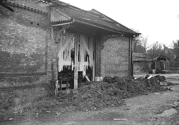Photo by Nick Catford ![]() The north end of Stanmore Village goods shed in June 1968. Evidence of the fire damage is seen on the right with charred timber of the covered loading area adjacent to the shed.