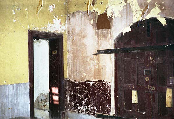 ![]() Inside the main entrance the church-like door was secured but it failed to stop the vandals from getting in. The station building was in very poor condition internally.
