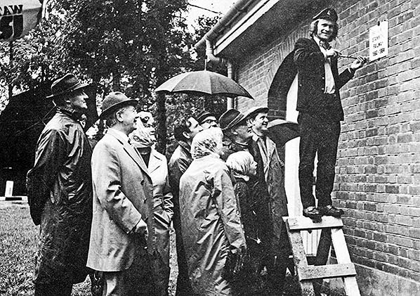 Fixing a commemorative plaque onto the front of the rebuilt station building