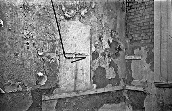 The blocked ticket window inside the Stanmore Village station building in March 1969. In later years all of the doors and windows were blocked to deter vandals but the ticket window might have been blocked when the building was in use to store potatoes. Photo