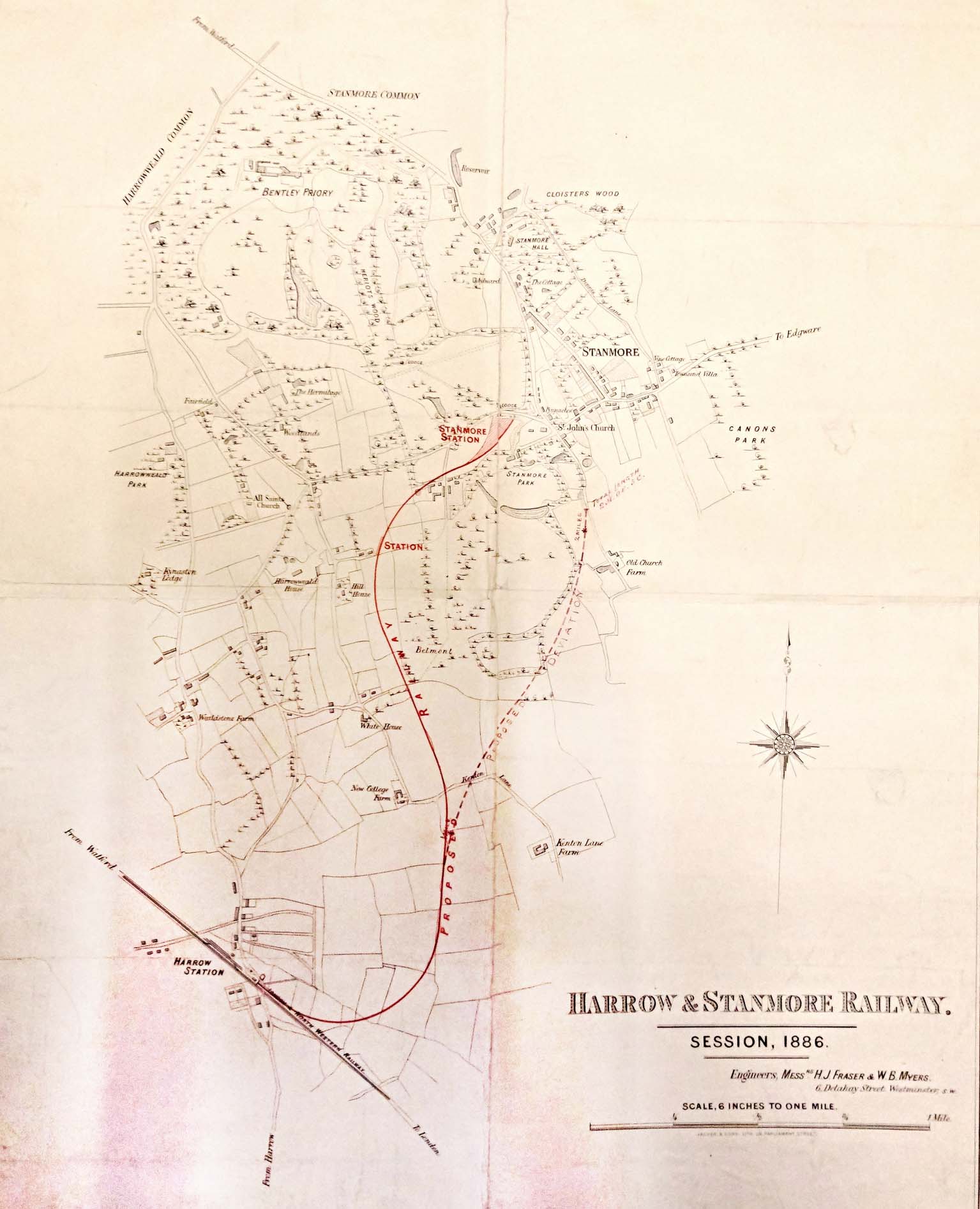 Proposed route of the Harrow & Stanmore Railway and a proposed deviation. Click