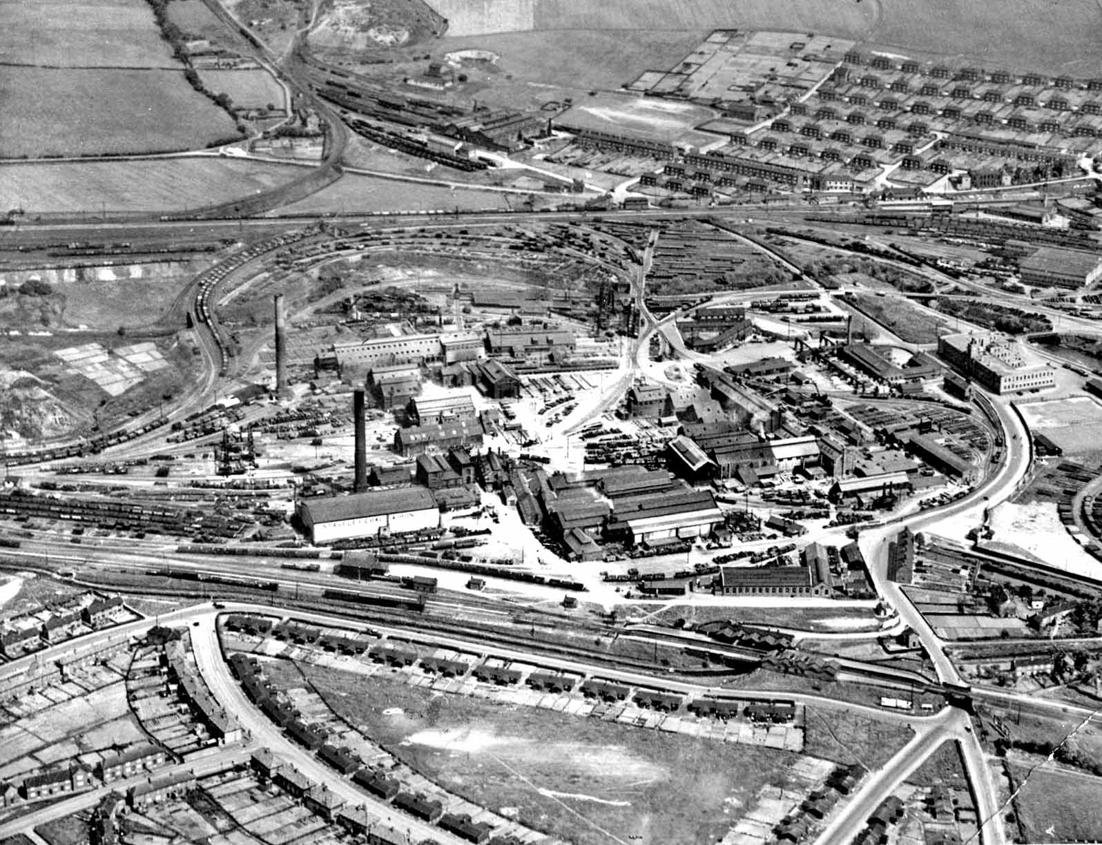 Staveley Works station and goods yard is seen at the bottom. Staveley iron works is in the centre and in the distance Barrow Hill MPD is seen. Staveley Roundhouse was built to a standard Midland Railway square shed design in 1870. After 1948 it became known as Barrow Hill so as not to confuse it with the ex-Great Central shed nearby. It was operational from 1870 until 9 February 1991. After closure, the building was heavily vandalised. After lobbying of the local council, the building was Grade 2 listed by the Department of the Environment in February 1991. Following negotiations with the British Railways Property Board, Chesterfield Borough Council became the new owners of the shed and nearby yard on 20 December 1996. The council subsequently granted a recurring maintenance lease to the Barrow Hill Engine Shed Society, who secured and refurbished the site, including renewal of the original 1870 roundhouse glass roof, except for one section. Funding was provided by the council, Derbyshire County Council, the Transport Trust, North Derbyshire Training and Enterprise Council, European Regional Development Fund and the Government SRB fund. The site reopened to the public in July 1998. Today, still retaining its connection to the UK national rail network through Network Rail, it is the home to many preserved British railway locomotives.