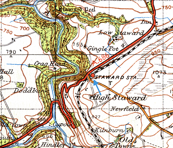 Notes: There was no village or hamlet here. The station was named after neighbouring farms and a derelict pele tower. Being at the junction of the West and East Allen valleys, it was the railhead for livestock traffic from a wide area. The diminutive goods yard was equipped with ‘coal cells’ – storage areas beneath the rails into which coal was poured through hatches opened in the wagons. The stone-built house faced the single up (north) platform. Passenger facilities were in a pent-roof wooden shed, with a centrally located door flanked by windows. The house was formerly let as a holiday cottage by British Railways. (From 1.4.1939 the station was renamed Staward Halt although by this date it was only open for goods traffic.)