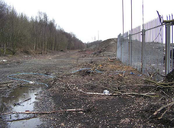 ![]() Looking east at the site of Stockport Portwood station in April 2010. The single platform terminus that was Stockport Portwood closed in September 1875 after the line had been extended westwards. Extensive goods facilities developed at the site on the area of ground to the right of the picture behind the metal fence. The goods facilities lasted until April 1966. Photo by Paul Wright