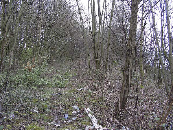 Looking east at the site of Stockport Tiviot Dale Station from the site of the trackbed in April 2010. The trackbed was a much lower elevation and has been buried under tipped earth. To the right of the picture can be seen a concrete fence on the other side of which is the M60 motorway. The motorway occupies the site of the stations main building.