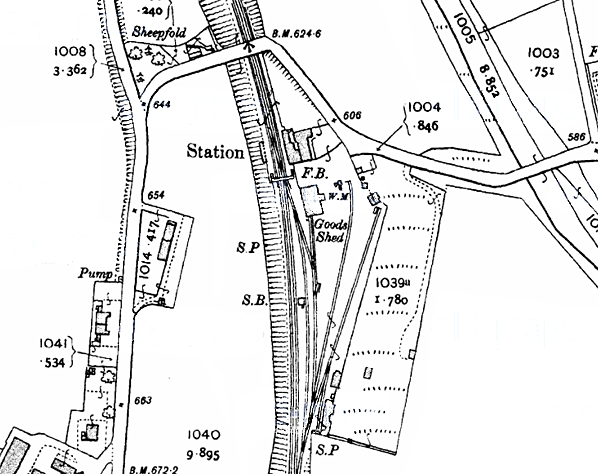 A signal box was sited 100 yd south of the station on the up side. This controlled access to the goods yard which comprised a loop allowing access to the yard from both directions and three sidings. One of the sidings running parallel with the main line served a large goods shed with a hipped slate roof. The other two sidings ran diagonally across the yard. A weighbridge and weigh office stood close to the end of the middle siding, and a 1 ton 10 cwt crane was in the yard.
